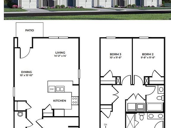 The Pearson by D.R. Horton is a stunning 2-story townhome plan featuring 1,418 square feet of living space including 3 bedrooms, 2.5 baths and a 1-car garage. The main level eat-in kitchen with large pantry and modern island opens up to an airy, bright dining and living room. WHITE cabinets and granite countertops highlight the kitchen with hard surface flooring throughout 1st floor. The upper level integrates 3 bedrooms, all with generous closet space, a hall bath, upstairs laundry, and spacious owner's suite that highlights an owner's bath with 5' shower and double bowl vanity w/quartz counter. Smart home package included!