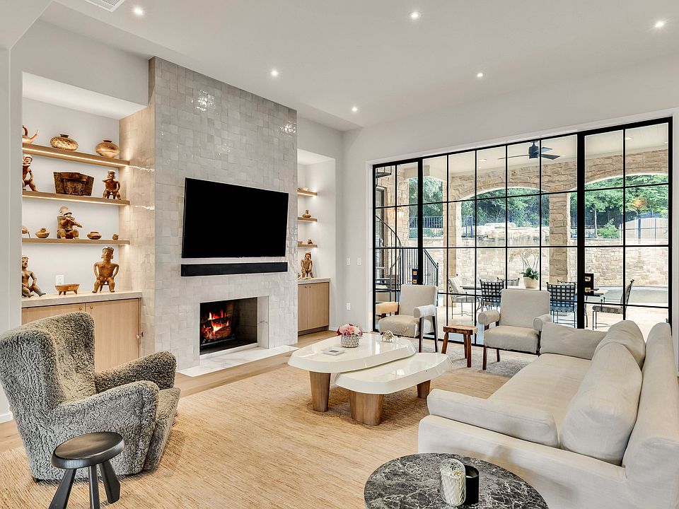Tucked behind the gates of Somerset in West Lake Hills, The Summit House sits elevated—both in position and in design. With panoramic views of the Austin skyline, the twinkle of city lights becomes part of the home’s ambiance, casting a glow that shifts with the light of day. Recently reimagined through a $2 million architectural and interior transformation by Elizabeth Stanley Design, this 8,200+ square foot estate is a masterclass in bold, organic contemporary style. The result is a rare blend of vision, warmth, and total privacy—crafted for those who value timeless luxury at scale. Every inch has been elevated: steel-framed doors and windows throughout, unlacquered brass fixtures, reclaimed white oak cabinetry, and polished Taj Mahal marble. The main living room is expansive yet grounded, centered by a marble-tiled fireplace and surrounded by custom built-ins and natural light. A formal dining room offers an intimate space to gather, while the private study stuns with a terrazzo fireplace and full bar—one of the most memorable architectural moments in the home. The kitchen is streamlined and sophisticated, with integrated appliances, Taj Mahal quartzite counters, and a full butler’s pantry tucked behind—complete with a second oven, wine fridge, and built-in coffee station. The owner’s suite is a retreat unto itself. Anchored by a fireplace and steel doors that open to the backyard, it features two oversized closets and a spa-style bath designed with clarity and calm in mind. With seven bedrooms total, the home was designed with everyday function in mind. Two full laundry rooms—one on each level—ensure ease and efficiency for a household of this caliber. Upstairs, the thoughtful layout continues with a full guest apartment—including two bedrooms, a kitchen, and living space—plus a spacious media room, and an expansive game/living room that opens to its own terrace with sweeping views of the downtown skyline. Additional bedrooms each offer their own personality and palette; one features a bay window with custom built-ins and a postcard-worthy view. For collectors, five garage bays with epoxy floors accommodate up to twelve vehicles—one of which is climate-controlled and currently houses a full golf simulator. An elevator connects both levels of the home for effortless access. Step outside to a private resort experience: a cascading waterfall flows into the pool, flanked by covered terraces, an outdoor dining area, and a sport court—all framed by flat lawn and panoramic Hill Country views. Just minutes from downtown yet completely removed, The Summit House is a design-forward sanctuary that delivers on scale, serenity, and elevated living.