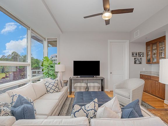 Luxury condo, with open floor plan, 10' ceilings, walls of glass & 2 balconies overlooking Finley Golf Course. Largest floor plan in East 54. 2 Bedrooms, 2 Full baths, Den/ office. Bamboo floors throughout! Granite kitchen with large island, SS appliances. 2 assigned secure parking spaces next to the elevator, and 1 storage space on Lower Level. Amenities include roof top saltwater pool, fitness center with 24 access, children's playground & Bocce Ball park. Walk downstairs to restaurants, pharmacy, coffee shop, shopping and grocery. Hiking & running trails across the street. Located off HWY 54, minutes away from UNC & medical centers. Easy access to Duke, I-40 & RDU. Certified by the US Green Building Council's LEED.