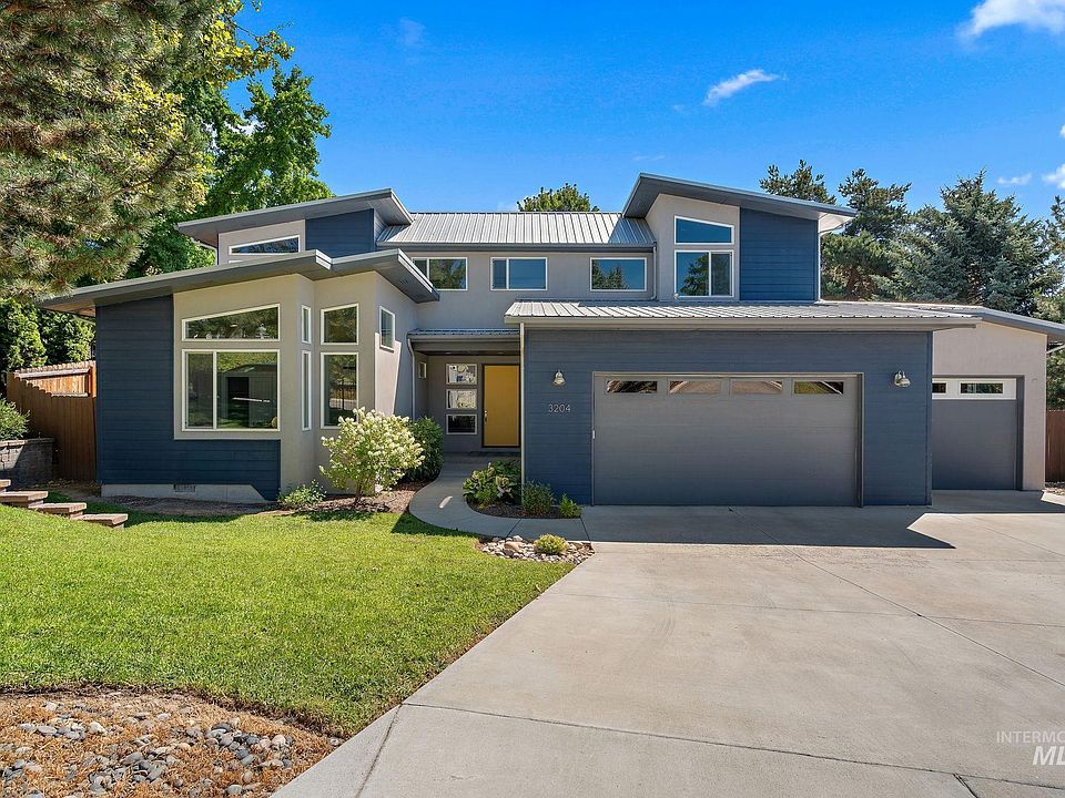 Welcome to your dream home in Boise's coveted North End hills! This striking modern residence masterfully blends contemporary elegance with functional living. Sunlight floods the interior through expansive windows, casting a warm glow over the sleek kitchen, the inviting living room, and the beautifully landscaped backyard. The main level features a luxurious primary bedroom with private patio access, a thoughtfully designed office space for productivity, and a living room anchored by a stunning reclaimed barn wood fireplace, flanked by a custom bar area. Upstairs, 3 spacious bedrooms provide comfort for family and guests, complemented by a versatile loft perfect for relaxation or recreation. Step outside to discover a shaded patio ideal for summer BBQs, an expansive yard for outdoor activities, and custom garden boxes with fruit trees on the hillside. With hiking and biking trails at your doorstep, schools nearby, and downtown just minutes away, this home is a perfect blend of style, comfort, and location.