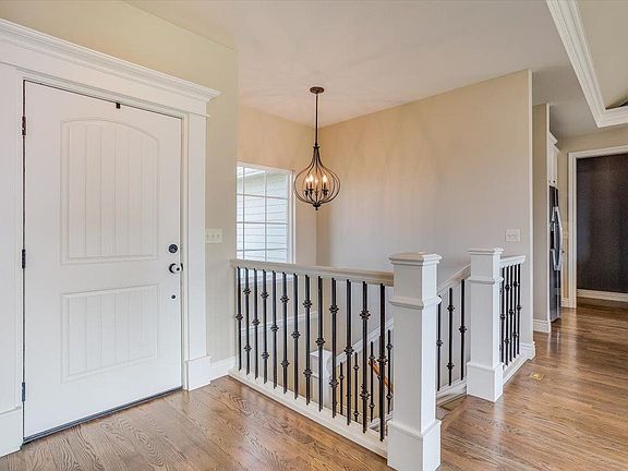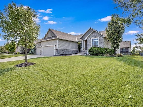 Spectacular home with exquisite style and inviting open living areas located in the beautiful Fontana subdivision and the Maize School District! The gorgeous barrel ceilings and fantastic windows provide incredible natural sunlight throughout the main living areas. Enjoy the beautiful wood floors, stacked-stone gas fireplace, open wood shelving and stunning light fixtures in the open living and kitchen areas. The kitchen is exceptional with awesome cabinet and counter space, a large island with great eating bar space, solid surface countertops, stainless steel appliances, large walk-in pantry and separate drop-zone area. The dining room opens to the covered deck – the perfect arrangement for grilling and backyard enjoyment. The split bedroom plan includes a gorgeous ensuite: a spacious primary bedroom, and a spa-like bathroom which includes two separate sink vanity areas, soaker tub, separate tile shower and large walk-in closet that opens to the laundry room for awesome convenience. The main floor also includes two additional bedrooms and another full bathroom with a tub/shower, granite topped vanity, and large linen storage, and a garage entry door area with great space for both hanging items and cubbies for storage. Escape to the expansive family/media area in the basement to enjoy a movie evening or entertain with the stylish wet bar. The family room features a gorgeous rock accent with wood trim around the gas fireplace. The wet bar includes open shelves on both sides of the viewout window, eating bar and beverage cooler. Just off the family room, striking sliding doors open to an awesome flex room with a closet and viewout window, that could be used as study or computer area, office, playroom, exercise room or a bedroom. The basement also includes an additional bedroom with a large walk-in closet and another full bathroom with tub/shower, granite-topped vanity and stylish stacked stone backsplash tile, a finished office room, and large storage room. This beautiful home is in a great neighborhood with easy access to schools, shopping, dining and highways, and is situated on an awesome lot with an east-facing backyard to enjoy the large, covered deck, and has a private covered patio/walkout area off the basement family room and wet bar, full wrought-iron fencing, irrigation well and sprinkler system. This home is move-in ready and feels like new! Enjoy the beautiful indoor and outdoor living with your family and friends including beautiful lake views, and fantastic summer sunrises and sunsets.