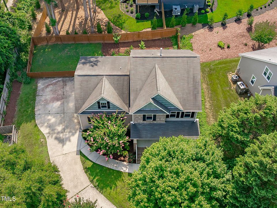 Welcome to this beautifully maintained home in the sought-after Turnberry community! Enjoy your morning coffee or chat with neighbors on the charming covered front porch. Step inside to a welcoming entryway with transom window, sidelights, and elegant crown molding that opens into a spacious family room with a gas log fireplace, custom mantle, modern light fixture, and a flexible layout to suit any style. The bright dining area features a stylish fixture and seamless flow to the kitchen—ideal for easy entertaining. At the heart of the home, the timeless kitchen offers granite countertops, stainless steel appliances, a center island, pantry, and a cozy breakfast nook with a large window overlooking the private backyard. A convenient powder room and coat closet complete the main level. Upstairs, the expansive owner's suite is a true retreat with a sunny seating area, ceiling fan, plush carpet, and space for versatile furniture arrangements. The ensuite bath includes a dual-sink vanity, soaking tub, private water closet, and glass-enclosed step-in shower. Three additional bedrooms, a full hall bath, linen closet, and a laundry room with extra storage complete the second floor. Enjoy outdoor living in the neighborhood trails or at home with a covered front porch, back patio, and fenced yard—perfect for play, relaxing, or adding a future fire pit. Ideally located just off Millbrook Road and only 1.5 miles from US-70, with shopping, dining, parks, and commuter routes just minutes away!
