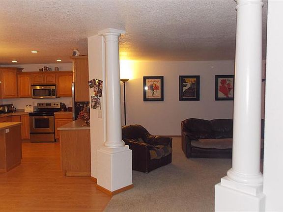 Spacious home with over 1,450 square feet on the main level & 1,344 in the lower level! The interior has neutral decor, ready for you to personalize with an open floor plan and columns to the entrance of the large living room. The kitchen offers stainless steel appliances, corner pantry, plenty of cabinets & counter space and a snack counter for stools. The dining area has a patio door to the deck overlooking the back yard. The main floor has 2 large bedrooms & 2 bathrooms including the master suite with cathedral ceilings, walk-in closet & private master bath with whirlpool tub, separate shower & dual sinks. The unfinished lower level has roughed-in plumbing, egress windows and endless possibilities for additional bedrooms and a large family & rec room. This home was built in 2005 with 2x6 construction and includes a triple attached garage with water & floor drain. The exterior is maintenance free with steel siding. The location is wonderful, in a private cul-de-sac in NE Bismarck.