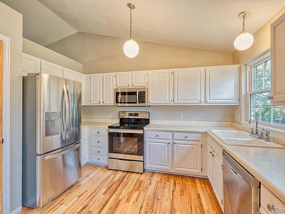Welcome Home! This beautiful property boasts hardwood floors throughout the living room, kitchen and family room. Tastefully updated with fresh paint, new carpet, and new stainless steel appliances! Champion windows throughout the house with tilt in sashes for easy cleaning and sliding screens. Anderson French door in family room. Upstairs you will find 3 bedrooms and 2 full baths. The generous master has vaulted ceilings, a picture window and updated full bath. Two secondary bedrooms share another updated full bath. The finished basement has a rec room or 4th non-conforming bedroom, updated bathroom and laundry room w/ washer & dryer. Whole house attic fan is great for cooling in the summer. Enjoy the view from the back patio overlooking Columbine Meadows greenbelt and walking trail. Convenience, warmth, and charm awaits you in this lovely home located minutes away from excellent schools, I-25, Flatirons Mall, Orchard Shopping, neighborhood parks, trails, and recreational conveniences.
