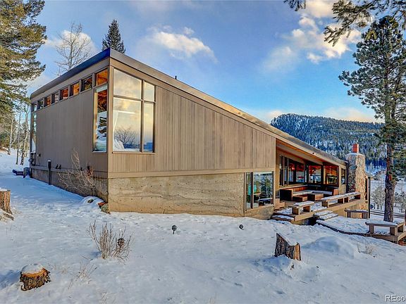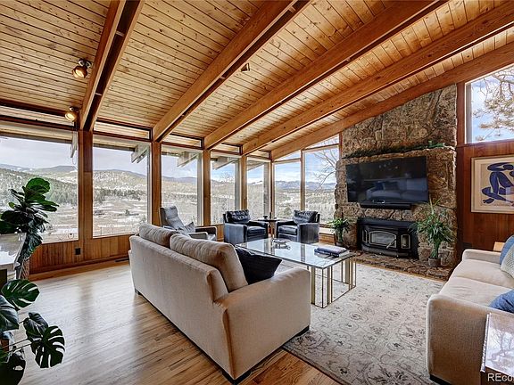 With stellar snow-capped Mt. Evans views and bordering hundreds of acres of open space – this property is a very rare and special find.  The equestrian neighborhood of Hangen Ranch is a hidden gem, and living here is a privileged Colorado lifestyle. The gorgeous home is classic mid-century modern with a wide & low footprint, indoor and outdoor spaces that complement each other, and floor to ceiling windows offering a sense of harmony with the gorgeous outdoor setting.  You will find multiple outdoor living spaces for every season – watch the sunset over the Rockies from the expansive west facing deck, or enjoy the intimacy of the private east courtyard with ponderosa’s and rock outcroppings. Inside, find a warm & inviting home with thoughtful MCM design. The living room beckons conversation & relaxation with stone fireplace & corner windows that take in the stunning views. Gather around the island in the well-appointed kitchen & enjoy entertaining with high-end appliances & plentiful cabinetry & counter space. The large picture windows to the courtyard brings the outdoors in as well. The kitchen & the adjoining breakfast room both have a built-in fireplaces for winter days, & you will love the bright & sunny den that takes in the incredible views. The large main level primary suite has ample closet space & features huge corner windows & is next to the all-season deck. You wake up to the alpenglow on the snow-capped peaks. Many mid-century features are original to the home and impeccably maintained. In addition to the 4 bedrooms, den, & family room you will find a great office area, main-floor laundry, & garage with plentiful storage. Outside you have 4.8  delightful acres with a plethora of aspen trees, rock outcroppings & your own private access to the gorgeous Alderfer/Three Sisters Park. The property is ideal for hot tub, fire pit & zoned for horses. Located just minutes from Evergreen amenities too! Don’t miss the video & 3D tour: www.32042HorseshoeDrive.info.