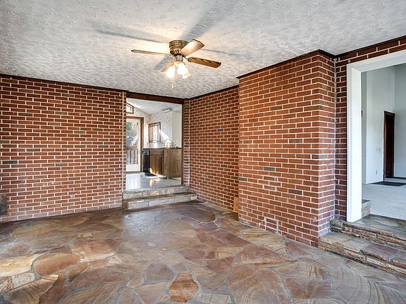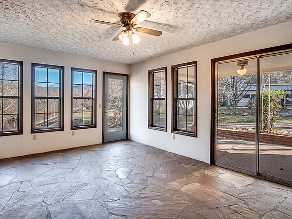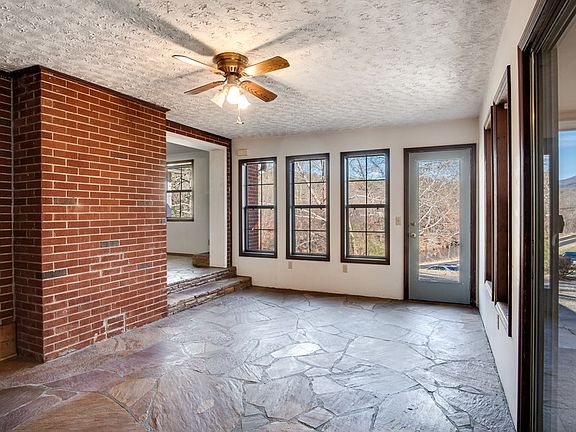 Brick ranch home up on the hill overlooking the Cullasaja River!! Paved driveway leads to a covered carport with a circular drive that circles around the back of the home. From the carport, enter into the den or around back and into the kitchen. Either way, bringing your groceries in will be a breeze. Kitchen opens to the den, the perfect place for your guests to sit while you're entertaining and cooking at the same time. Vaulted ceilings in the kitchen with upper windows that let in lots of natural lighting. Living area has a wood fireplace and lots of windows. Off the living room you'll find a sun room that would make the perfect little library complete with a built in bookshelf, office, art studio or sitting room... it's quaint and peaceful with a view of the water. Tucked around the corner are two bedrooms, a full bathroom and nice size laundry room. This home is ready for your special touches; bring a paint brush and make it your own. Great yard with room for a garden and to sit outside and enjoy the outdoors. Property runs behind the house with acreage that could allow for another home if you choose.Outbuilding for additional storage. Lots of parking. Paved to the door!