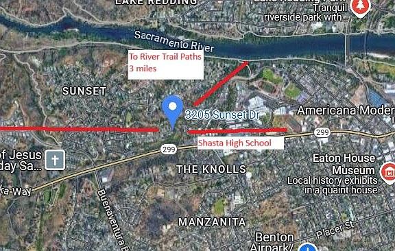 Wow - what a Sunset Terrace charmer. Built in 1956 with open tongue and groove ceilings and walls. This home just needs some loving touches to bring it back to its glory days. Large living area with a window wall with majestic views towards Mt Shasta, cute kitchen and more. Almost a Frank Lloyd Wright style look. Walk out back to Open Space and listen to the seasonal creek. Detached 280 sqft garage plus a small basement storage area under the home. Located at end of cul de sac with all the local City amenities, rivers, lake and Shasta High School and UPREP is walking distance away. Enjoy the walking within the surrounding development. Less than 2 miles / 6 minutes to downtown Redding. Less than 9 miles to Whiskeytown recreation lake and 13 miles to Lake Shasta.