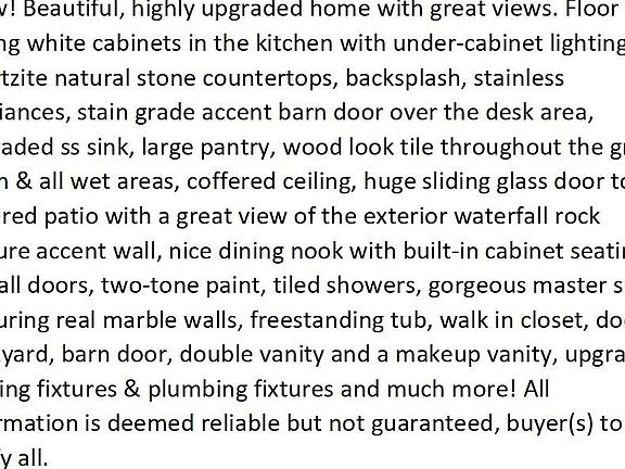 Wow! Beautiful, highly upgraded home with great views. Floor to ceiling white cabinets in the kitchen with under-cabinet lighting, quartzite natural stone countertops, backsplash, stainless appliances, stain grade accent barn door over the desk area, upgraded ss sink, large pantry, wood look tile throughout the great room & all wet areas, coffered ceiling, huge sliding glass door to the covered