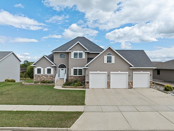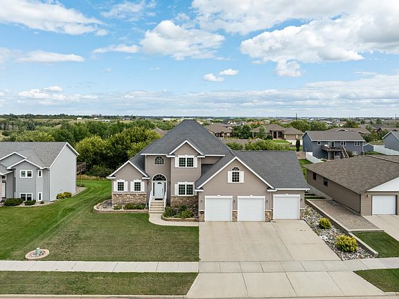 Welcome to a truly remarkable custom-built two-story home, where modern sophistication meets timeless design. Situated on the desirable south side of town, just minutes from the Bluffs Golf Course, this home offers a perfect blend of luxury and convenience. From the moment you arrive, you'll be captivated by its striking curb appeal. The exterior, with its modern siding and stone accents, is beautifully complemented by a meticulously maintained lawn, complete with vibrant flower beds and thoughtful landscaping. As you step through the grand entrance, an elegant arched window floods the foyer with natural light, instantly making you feel at home. The living room is both grand and inviting, with soaring ceilings and a floor-to-ceiling gas fireplace that serves as a stunning centerpiece. Large windows let in plenty of light, creating a warm and welcoming atmosphere. The kitchen is a dream for anyone who loves to cook or entertain. It features a large granite island that offers plenty of workspace, top-of-the-line stainless steel appliances, and warm wood cabinetry. The stylish backsplash adds a touch of flair, and sliding glass doors open to a spacious deck—ideal for those who enjoy indoor-outdoor living. The main level also boasts a luxurious primary suite, complete with vaulted ceilings, a spa-like ensuite bathroom with dual vanities, granite countertops, and a roomy walk-in closet. Upstairs, you’ll find two additional bedrooms, a full bathroom, and a versatile bonus room that could easily become a sixth bedroom if needed. The lower level is perfect for entertaining, with a large recreational room, two more bedrooms, a full bath, and a dedicated laundry room. The backyard is your private oasis, featuring a well-manicured lawn bordered by pristine white vinyl fencing. Mature trees provide shade and privacy, while the elevated deck and shaded patio offer perfect spots to relax or host gatherings. Located within the highly regarded Minot Public School District and just a short walk to Jon Hoeven Elementary School, this home is designed for comfort, beauty, and convenience. It’s a place where every detail has been carefully considered, and it’s ready to welcome you home.