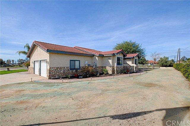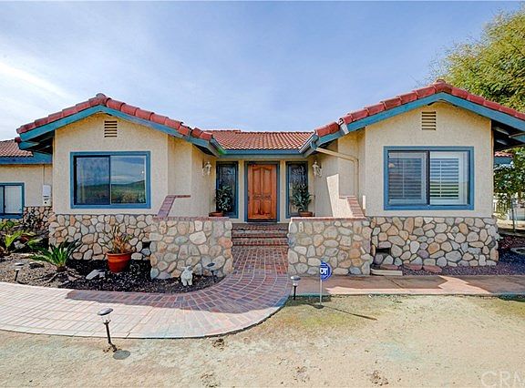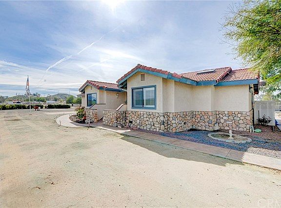 Menifee energy efficient 2374 sqft single story home on solar highly upgraded throughout. Brick walkway winds front courtyard and brick staircase.Formal entry opens to diagonally laid wood.Living room is straight ahead with full bar on the left.Living room has a stone fireplace with heatilator.and built in entertainment center.Kitchen has wood floors running from the bar to formal dining.The kitchen is quite large with granite slab counters and stone backsplash and walk in pantry. Formal dining room has gorgeous chandelier with crown molding.Tiled laundry room has large prep area and built in ironing board.Master bedroom is stunning with crown molding throughout,and a master bathroom with walk in closet,dual sink vanity and walk in shower. The 2nd bedroom is complete with decorative moldings,shutters and wood floors.The hallway bathroom has been remodeled with tile floors,tiled shower and tub combo.Patio is breathtaking with panoramic mountain views,ceiling fans,and plenty of sitting areas.BBQ island stone decor wraps around the pool providing a continuing line of elegance throughout the backyard as the fence and island become one.Pool is a good size with a raised spa.The grounds of this property are a ranchers dream. 81 sqft shop,tournament rated horse shoe pit,bocce ball court,RV hookups with cleanout,sitting area,firepit fenced in garden area,plenty of trees,stables,riding areas,storage building,and more while still being just minutes from the freeway and shopping centers.