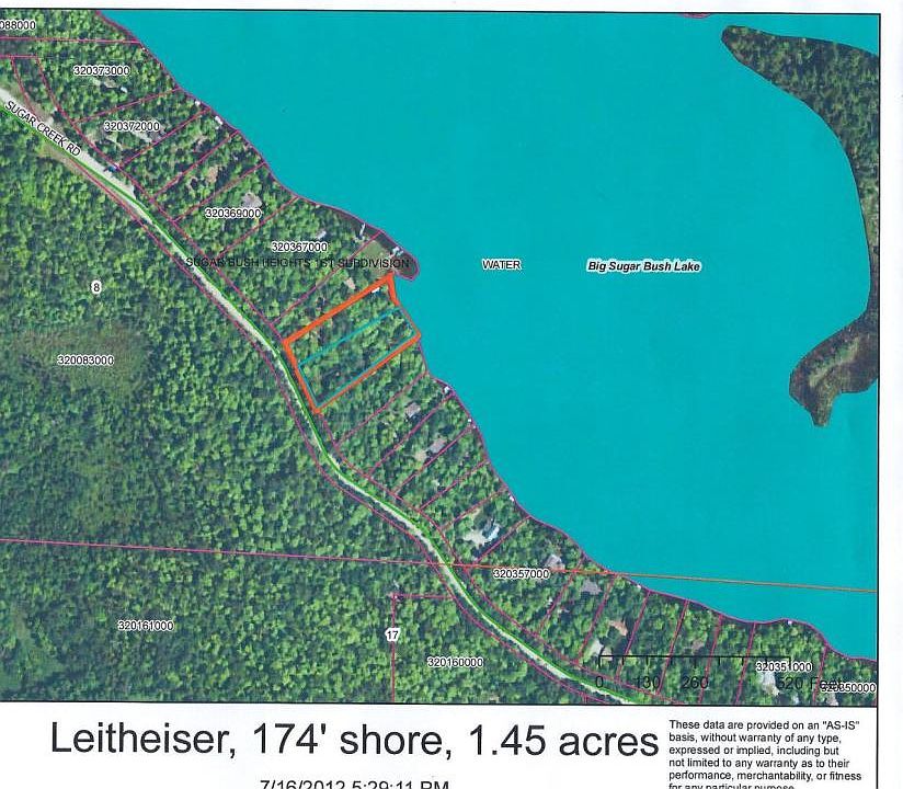 Large wooded lot on the west side of beautiful, clear Big Sugar Bush Lake. The lot is 174' of shoreline, about 1.4 acres, heavily wooded in maples and other hardwoods and partially cleared. Deck and steps to lake in place. Shed, dock, and small boat lift included. Building spot is level. Driveway to be graveled. Power in. Big Sugar Bush is 472 acres with water clarity of 15' and excellent fishing. Owner will look at offers!