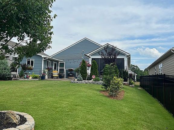Outdoor oasis! Meticulously Maintained Open Design Featuring tons of Upgrades – large Lot with Lush Landscaping, Outdoor Lighting and 3 season room Porch! Wood Floors in main area and upgraded LVP in ALL bedrooms, Neutral Colors, Upgraded molding, Blinds, Upgraded Lighting/Fans, Lovely Kitchen w/Grey Cabinetry, Pantry, and Breakfast Bar. Great Room w/ stone Fireplace – Opens to Porch. Primary Bedroom with shiplap accent walls-, Bath with Raised Double Vanities, & Tile Flooring. Two Additional Bedrooms and full Bath with Tub/Shower Combination. Laundry Room w/cabinets/Tile Flooring. Bonus is the entertainment shed attached to the beautifully private patio to give the home even another option when entertaining friends and family. HOA Fee Includes Lawn Maintenance. Fabulous Neighborhood Amenities. Expect to be Impressed