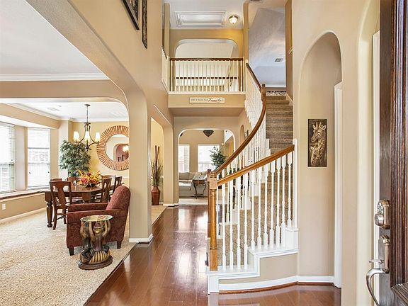 Elegant living & year round amenities await you in the gated community of Canyon Gate at Legends Ranch. This Meritage Home boasts 4000+sf, endless updates and a spacious open floor plan. Both formals,and a private study w/French Doors, soaring entry w/rich hardwood floors and a stunning curved staircase. Family time will be better than ever w/generously sized spaces to gather throughout the home. Open to the breakfast, formal dining and family, the kitchen is truly the heart of the home! Guests can hang out at the breakfast bar, or join the cook in the huge island kitchen. The master suite is privately tucked away and truly offers your very own getaway w/jetted tub, separate shower, dressing room, and a Walk-In Custom closet to die for! Second private gated entry off Birnam Woods lets you stay away from Rayford. The upstairs offers an enormous gameroom, wet bar and a media room. Just minutes from 99, 45 & HTR, HEB, dining and more! Take your own Interactive tour w/the Immersion link!