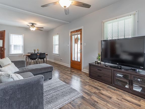 Not only is the exterior appealing, so is the inside of this west side bungalow featuring 1560 SF of living space. Sellers have taken out a wall in the living/dining area making the floor plan optimal. All flooring in home has been upgraded with exception of the laundry room. Kitchen has tons of character and style, with original built-in hutch, two toned cabinets, sink with newer cup rinser and all the appliances in kitchen are included (gas range, refrigerator, microwave as well as built-in ironing board and cutting board). The center island in kitchen was an addition and is perfect for cooking and will also be included in sale. Main floor bedroom is currently used for office and features deep closet and newer ceiling fan. Full bath on main level was updated and boast the original claw foot tub with shower. Currently the upper level is where the primary suite is located. With large area for closet and built-in bench storage plus floored attic that would be excellent for an additional bath. Backyard is completely fenced in with maintenance free material, covered deck, 1 car garage with work bench and a doll house/play house shed featuring dutch door. Other nice amenities and updates include: washer/dryer included, roof 2018, electrical panel 2019, ceiling fans 2022-2023, interior house painted in 2022, new trex decking on front porch 2024, HVAC 2019, under contract with Swat Pest, newer smart thermostat, ring door bell and much, much more! 1 year home warranty included for buyers pease of mind. Character, space and updates all in one home.