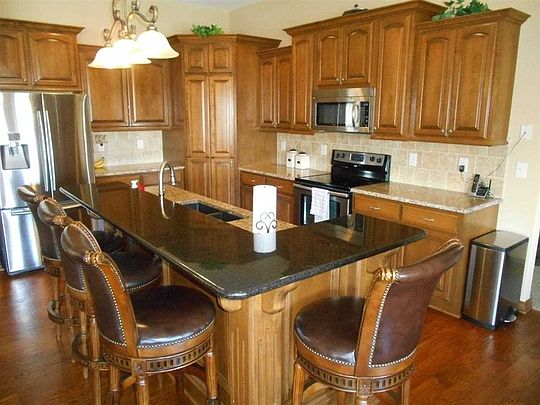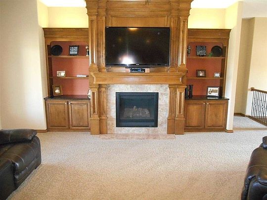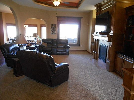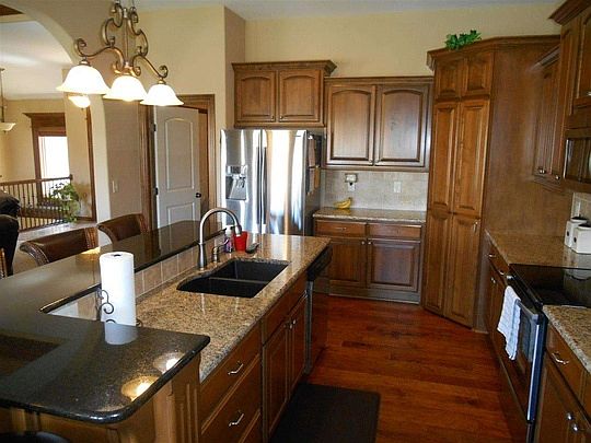 Beautiful details in this five bedroom lake lot home. Open living room/kitchen/dining room all have lake view. From granite counter tops, maple woodwork, walk-in pantry, tile backsplash, pull-out shelves and stainless steel appliances, this is a kitchen that every cook will appreciate. A beautiful built-in buffet with glass doors is perfectly placed between the kitchen and the dining area. The open living room has a coffered ceiling with accent lighting, plus a striking gas-log fireplace. This home has a split bedroom floor plan and what an impressive master suite! Enjoy the master bedroom with a lake view. Love the over-sized master walk-in closet that includes a large, built-in dresser. The master bath has two separated tiled sink areas, a whirlpool tub, a separate shower, a linen closet, a private toilet area and tile flooring. The two bedrooms on the opposite side of the home are separated by the second full bathroom on the main floor. The convenient laundry room is located off the kitchen. Spend summer evenings on the covered, tech deck located off the dining area on the east side of the house. The walk-out basement includes a large area with a corner gas-log fireplace perfect for family gatherings or tv watching. Plenty of room for a game area (pool table or ping pong or card games). The wet bar is spacious. Also downstairs are two bedrooms and a full bath.