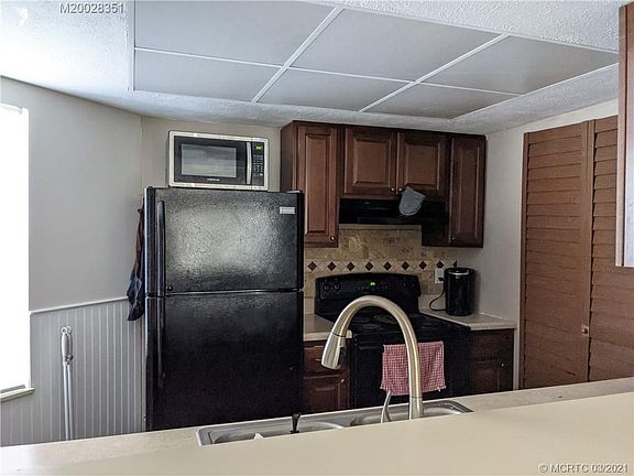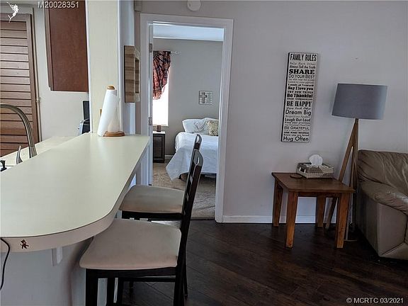 Spacious ground floor condo with living area in the center and two bedroom suites at opposite ends. NEW A/C. Owner has extra of the laminate flooring. One bath has a walk in shower, the other a tub/shower combo. Decorative wainscot defines the entry area and dining space. Kitchen updates in ceiling lighting, wood cabinets and tile back splash. The tiled enclosed porch has screened jalousie windows and an exterior door to shaded green space. The utility room has a full size washer and dryer. Village Stuart is a charming community conveniently located to businesses and byways. Pets under 25 pounds accepted. Vehicle parking restrictions. Residents enjoy well manicured grounds, BBQ area, heated pool and tennis courts. The condo units are uniquely positioned to all be corner/end units.