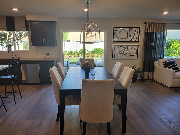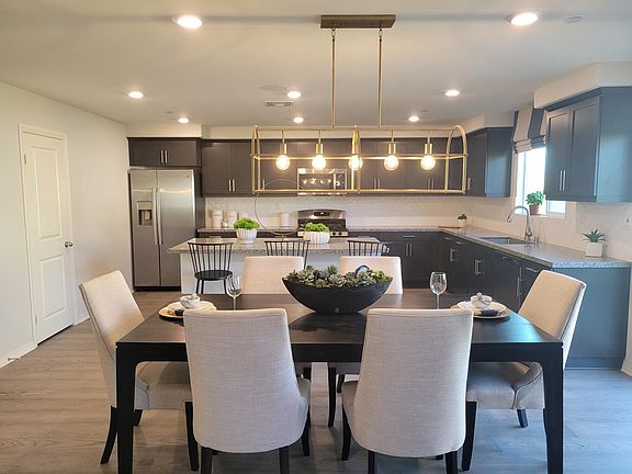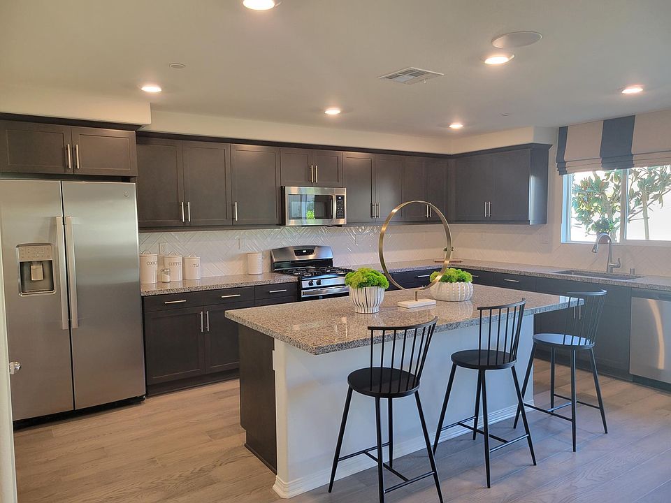 This model home, built in 2023, in Winchester features an upgraded kitchen with granite countertops and stainless steel appliances, including a refrigerator. A large center island overlooks the dining and living areas, creating a desirable open-concept floor plan. The first floor includes one bedroom and one full bathroom.