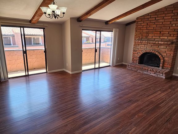 If you are looking for a classic Spanish style home, this condo is what you want. There is a beautiful carved wooden double door entry leading to the two large downstairs bedrooms. The home has a lot of hardwood and tile floors along each bedroom has a sliding door open to the walled patio that looks over to the community pool. There is a large bathroom and storage closets as well. The condo has an over sized attached two car garage (enough space to store a couple of large motorcycles) with laundry facilities (washer and Dryer). Upstairs is a huge great room. There is a very Spanish style fireplace, dining area and this is open to 2 balconies overlooking the courtyard and the pool. The galley style kitchen is equipped with a stove, microwave/hood combo/dishwasher/trash compactor, plenty of roomy cabinets and Corian counter tops. There is a large half bath in the hall and a huge master suite with balconies and a walk in closet. The master bathroom has dual sinks and a tub shower. Water and trash are included in rent 12 month lease required Military courtesy showed No Smoking! Water and trash included. Renter pays electricity and internet.