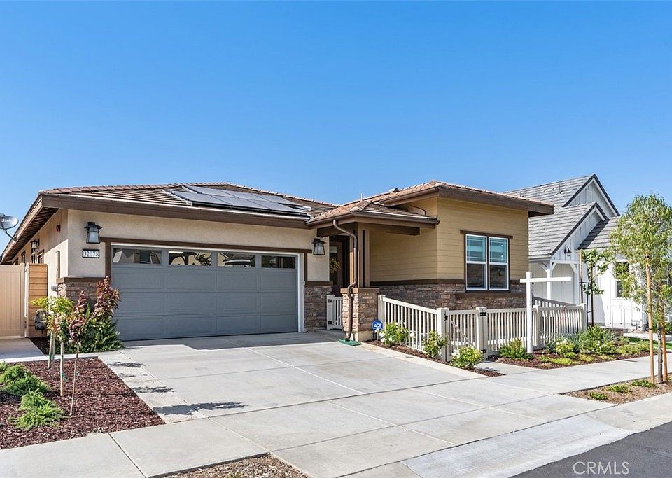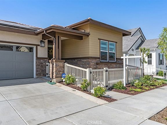 Temecula living at its finest, just minutes from Wine Country! The newest 55+ Resort like, Esplanade, a gated community, in Sommers Bend. This single-story home with 2 beds, a den, 2 and a half baths is fully loaded with upgrades and a view of the hill tops. The home has luxury vinyl planks, custom window coverings, beautiful decorative tile on kitchen backsplash, quartz countertops, walk-in pantry, 2 glass cabinet doors, recessed lighting, pendant lights, and a filtered water dispenser. Enjoy the open concept to the living and dining room with recessed lights, wired for ceiling fans, hidden wires for TV and extra outlets. The primary bathroom has extra cabinets, quartz countertops, separate shower and soaker tub with lovely quartz around the tub, gorgeous, upgraded tile on the floor and in the shower. There is a generous size laundry room with sink and upper cabinets. The backyard has an extra-large California room with recessed lighting, 2 ceiling fans, extra outlets, and pre-wired for an above ground spa. A pergola was added for a potential spa or extra entertainment area. There is turf, low drought tolerant plants, and an extended patio area for a BBQ. In the garage is a large cabinet and tankless water heater. The driveway has been widened, extra plants added, gutters, solar (seller will pay solar off at closing,) and a ring doorbell. This home is close to the elegant Esplanade Resort Clubhouse. Amenities include, pool, pickleball courts, BBQ area, fitness center, game room, and more. There are miles of walking trails. Enjoy seeing the colorful Hot Air Balloons, stunning hills and the conveniences of Temecula Wine Country. Take advantage of this ravishing home, amazing community and the heavenly surroundings. Your chance to live the Temecula Dream!