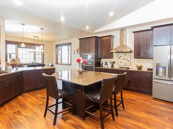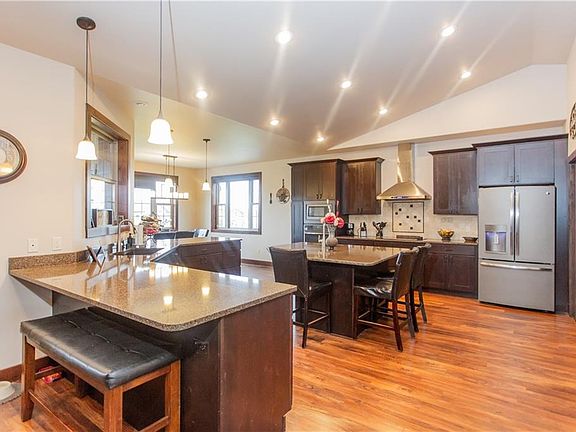 Custom builder owned home with high end finishes throughout. Beautifully landscaped with a pond across the street. This 5 bed 3 bath home boasts just over 4,600 sq ft with 5+ garage and RV parking. This home has quartz counters with vaulted ceilings & a gas fireplace. Huge master suite on main along with an office/bed & bath. 3 beds & bath downstairs with a huge second living area & wet bar along with a built in safe/panic room with steel door. The garage is finished & heated. Enjoy sitting on the covered patio with a built in grill. Hot tub stays!