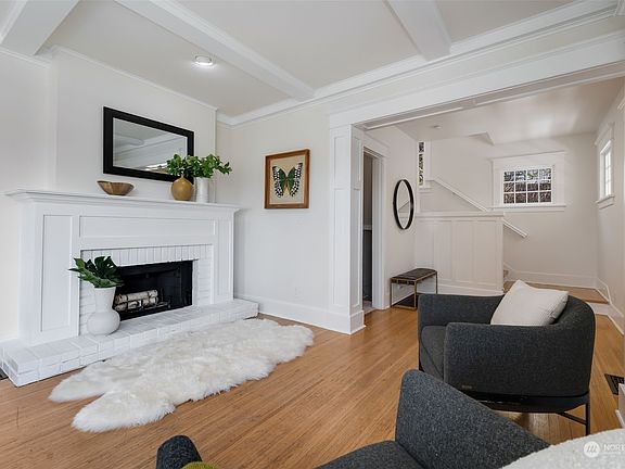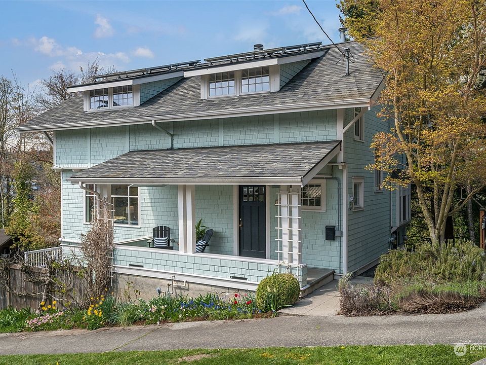 Madrona turn-of-the-century gracious home updated for modern living yet retains all the timeless vintage details. Set on a corner lot offering privacy & territorial views; the welcoming front porch leads to a proper entry & spacious living areas w/ soaring ceilings, rich moldings, box beams & rare narrow plank hardwood floors. A well-appointed kitchen w/ gas stove, quartz counters & bar seating compliments the incredible backyard w/ a deck for al fresco entertaining. Upstairs is the ideal layout of a primary suite plus 2 add’l bedrooms & full bath. Daylight basement has a guest suite, family room & office. Updated systems, solar panels, EV charger round out this special home. Walk 5 blocks to eats, drinks, parks, retail of Madrona Village.