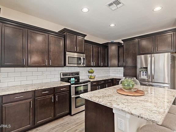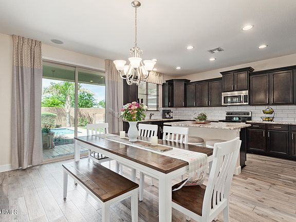 Welcome to your beautiful 5 bedroom, 3 bathroom home in the gated community of Lehi Crossing! Highly upgraded former model home with new wood tile flooring throughout entire first floor. Eat in chef's kitchen with stainless steel appliances, staggered cabinetry, granite countertops, tile backsplash, and kitchen island opens to great room and overlooks backyard. Private backyard with no neighbors behind features pool with Baja deck, wood burning fire pit, extended covered patio, travertine patio, and turf play area. One full bedroom and bathroom on first floor. Primary suite with oversized walk in shower and closet, two sinks and private toilet room. Lehi Crossing features children's playgrounds, basketball courts, volleyball courts and parks. Conveniently located near 202 freeway and Sky Harbor airport.