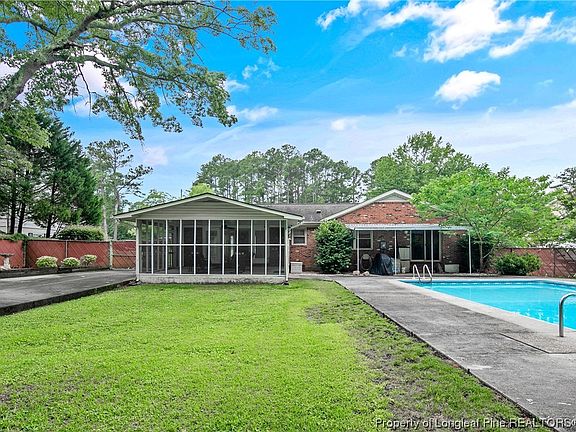 You'll be ready for summer with this backyard! A true oasis, offering a fully fenced, private retreat for relaxation & recreation. The highlight is a 20’x40’ in ground pool, perfect for cooling off on hot summer days & hosting poolside gatherings. The 400sf screened patio adds a delightful space for outdoor dining & lounging. Detached 2-car garage currently houses a SkyTrak golf simulator room that can remain, become a He/She Shed, media room, or interactive workout area. This timeless brick home offers over 2000sf of living area: 3beds & 2baths; spacious formal areas–perfect for entertaining; a well-designed, updated kitchen with granite counters & stainless appliances; & a comfortable family room for kicking back. The gleaming hardwood floors were recently installed/refinished. Convenient location, minutes to everything you need, on a quiet street with mature landscaping & privacy from neighbors. Terry Sanford school district & walking distance to Fayetteville Academy. Welcome Home!