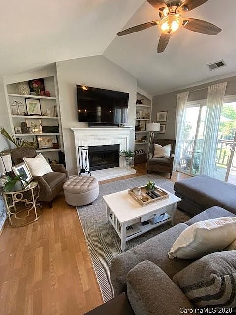 Desirable top floor unit in Hunters Run with vaulted ceiling and private balcony! Great room has fireplace w/ built-in bookcases on each side. Bar with seating in between kitchen & dining area. Opens to light filled great room. Hard wood laminate floors through all of main living areas. Updated bathroom with separate sinks. New sliding door leads to large balcony. Storage room off balcony. Great Location! Close to Dilworth & South End restaurants & shopping. Minutes from Uptown & Light Rail.
