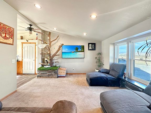 Welcome to this remarkable UBC residence, perfectly situated on a permanent foundation that allows for financing options equivalent to stick-built properties. The house harmoniously combines functionality with style, offering an attached garage and an impressive 4-acre plot, boasting unforgettable 360-degree views. Inside, you'll find a thoughtfully designed layout featuring 3 bedrooms and 2 bathrooms, accompanied by a spacious kitchen and inviting living area. The home is equipped with a comprehensive range of appliances, including a gas range, refrigerator, washer, dryer, dishwasher, and microwave, ensuring your convenience. For added peace of mind, the property features a reliable security system and a tankless hot water heater. The master bathroom is a sanctuary, complete with in-floor heating and a soothing jetted tub. The 2-car garage offers convenience and functionality, with roll-up doors, 220v power supply, and both heating and insulation. Moreover, a fully finished workshop awaits, presenting an ideal space for pursuing your hobbies, complete with heating, cooling, and ample shelving for storage. Step outside to discover a water system catering to the tastefully designed xeriscape, alongside RV parking and a storage shed. Buyer to verify all information.
