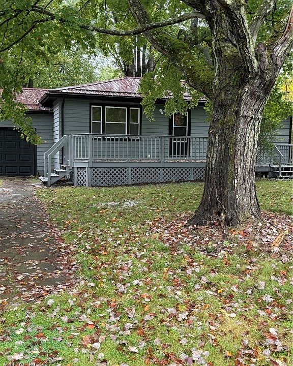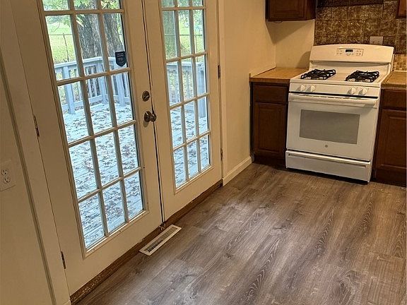 This home features both front and rear attached decks—freshly painted and perfect for relaxing or entertaining. The spacious kitchen includes a stove, refrigerator, and sliding doors leading to the rear deck.