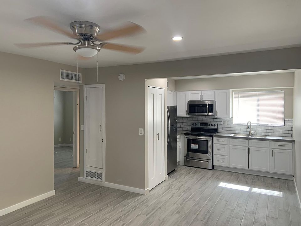 Newly renovated unit in central Phoenix. New Kitchen Cabinets New Quartz counter tops In unit laundry (new washer and dryer) New stainless appliances (new) New miniblinds/window coverings LED Light bulbs Recessed lighting in living room, kitchen and bathroom Security Door Wood plank tile throughout unit Modern finishes Subway tile backsplash Subway Tile tub surround Assigned covered parking (1 car) Fresh paint Ceiling fans in both bedrooms and living room Renovated bathroom with modern fixtures Owner holds a AZ real estate brokerage License Owner pays for water, sewer and trash. Tenants pays for electricity (SRP)