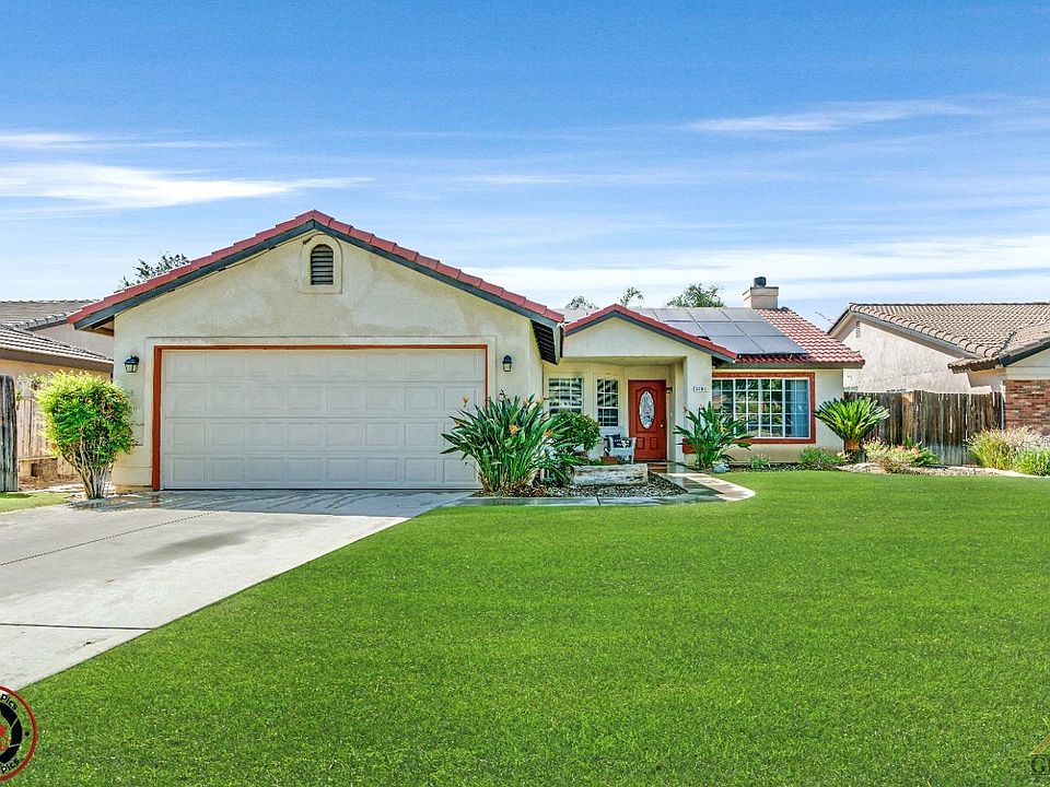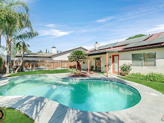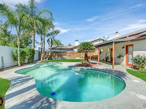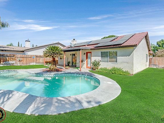 Welcome to this beautiful 3-bed, 2-bath home in North-West Bakersfield with award winning schools nearby and a family friendly neighborhood. Heading through the front door, into the living room, you will find a brick fireplace, carpet, and a ceiling fan. The kitchen is equipped with tile countertops, white cabinetry, LVP flooring, a dining area w/ hanging chandelier, and a breakfast bar. Each bedroom comes with carpet, large windows, and spacious closets. Both restrooms have modern colors and spacious vanities. The indoor utility room leads to the 2-car garage and has cabinetry for storage. Heading out back, you will see the covered patio area, inground swimming pool, mature landscaping, and the rear block wall. The home also has leased solar, which will help keep your energy bills low. Schedule a private showing today, before it is too late! Seller willing to offer a carpet credit with a strong offer. (Some pictures may have been digitally staged or enhanced)