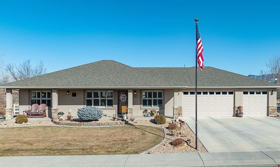 This immaculately maintained, Byler-built home offers the perfect blend of peaceful living, scenic beauty, high-quality construction, near-new condition, and exquisite functionality. The split floorplan home features two spacious bedrooms with a shared bath and a primary bedroom suite designed to provide privacy and convenience. The primary bedroom boasts an expansive walk-in closet with easy access to the en-suite bathroom with dual vanities, custom tile shower, and water closet. The heart of the residence is the open living and dining areas, served by the kitchen, which is well-equipped with modern appliances and ample white granite counter space, making for the perfect blend of entertaining guests and everyday convenience. The home has a south-facing entry and is surrounded by beautifully maintained landscaping watered by an automatic irrigation sprinkler system. The generous outdoor living space includes dual covered patios, providing ample space for enjoying the property to its fullest depending on the time of day. A matching stand-alone shed with electricity provides the plenty of needed storage room that can double as a workshop. Property additionally features graveled RV and trailer parking. One of the standout features of this home is its location! Situated on a non-passthrough street and backing up to open space/greenbelt with a seasonal pond, this one-of-a-kind property epitomizes a private country feel. Enjoy breathtaking views of the San Juan Mountains, Black Canyon National Park, and Grand Mesa from the steps of your future home. This Columbine Pointe dream home is ready to be your best home.
