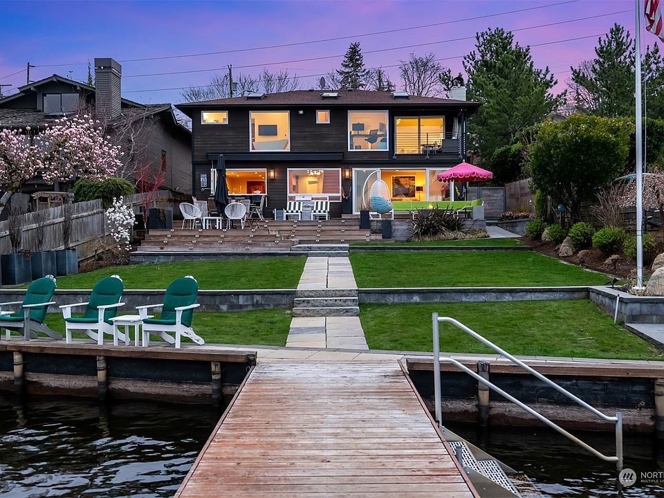 An incredible opportunity to own west-facing Lake Washington waterfront with a private dock. Drawing inspiration from charming beach bungalows, the completely remodeled, light-filled living spaces boast sweeping lake & Olympic Mountain views. Ready for entertaining w/multiple areas to gather, both indoors and out. Ironwood deck, entry courtyard & a level grassy area are designed for enjoying lake life. The updated kitchen offers quartzite counters & a bifolding window for serving cool beverages on a hot day. On the upper level, the view primary suite includes a private balcony, office, & a stunning spa-like bath. Three additional bedrooms include a separate apartment w/kitchen & bath. Get ready for summer on the lake at your sweet escape.