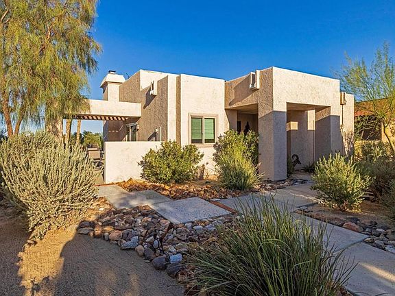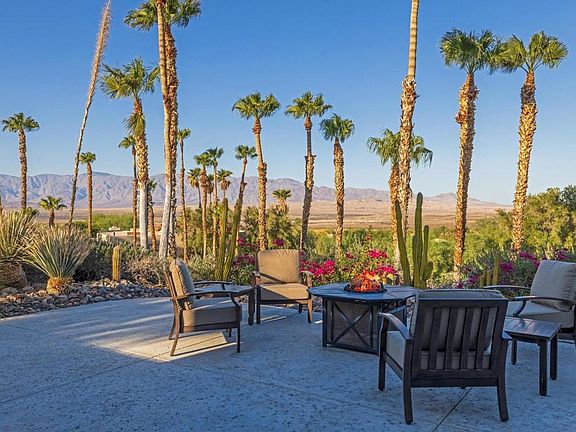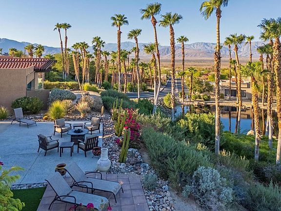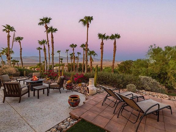 Pristine one level home offering breathtaking views of the Santa Rosa mountains, stunning sunrises, and the Rams Hill Golf Course. Overlooking a tranquil pond and community lap pool, spa, pickleball court/tennis court are within walking distance. Open-concept dining room and living room with beam ceilings, wood floors and cozy fireplace. Completely remodeled with new windows, doors, bathrooms and fixtures. The kitchen features granite counters, tile back splash and stainless steel appliances. The en-suite primary bedroom features a walk in closet, spa type bath with soaking tub, separate walk-in shower, marble vanity with dual sinks and chrome fixtures. Indoor-outdoor living is a highlight here, with ample patio space for relaxation and lounging while enjoying stunning views. If you're looking for move in ready, stargazing, golf, hiking, cycling, art appreciation, or simply to relax, this home is the perfect desert retreat.