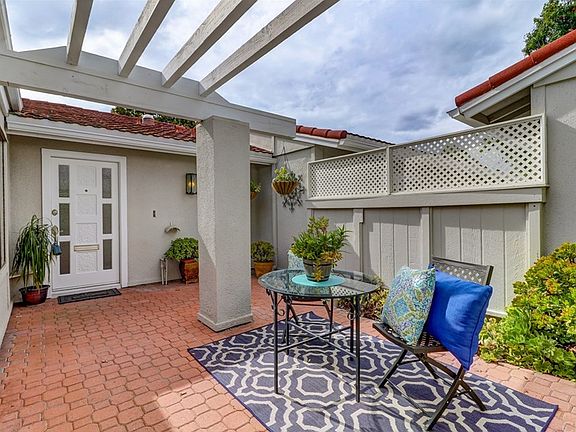 55+ community! 2BD/2BA Expanded "El Doble" CONDO located at end of the cul-de-sac with beautiful bluff-top location and lovely, open view! This spacious home features a one car attached garage with direct kitchen access and long driveway. Dramatic trellis-covered entrance has paver stone flooring and area to garden. Upon entry, your eye will go directly to the beautiful view behind the living room that includes a wood burning fireplace and leads out to the covered patio area. The area behind the home is private as you are up on the bluff so the wall is lowered to enjoy the view. The property has just been painted, has new carpeting installed and features smooth ceilings. Bright kitchen and dining area enjoys tile flooring, lighter tone updated cabinets, granite countertops, Solartube + recessed lighting and stainless dishwasher/range/microwave. Dining area has a ceiling fan plus window out to to the front patio. The added front room can be used for a variety of purposes and provides over 200 added square feet with laminate wood flooring and 3 additional windows. Master suites on each side separated by the living room feature windows enjoying the view and their own bathrooms. Upgraded, spacious vanity areas have granite-topped vanities, mirrored closet doors, wood-like flooring, updated faucets and fixtures, Solartube and tub-shower combo in each. Central air compressor was recently replaced. Convenient location to Gate 7/8 and shopping.
