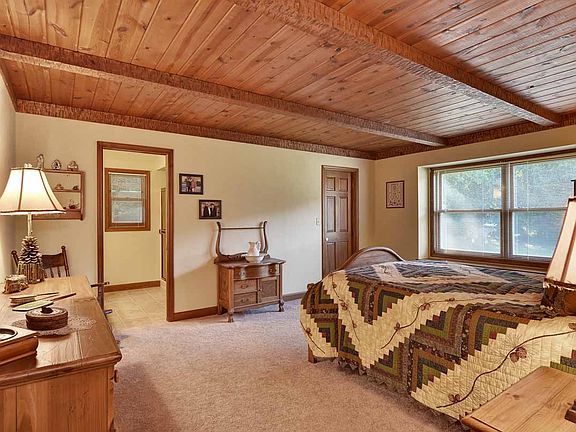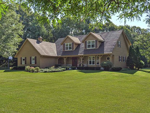 Original owner 4 bedroom Cape Cod on beautifully landscaped and private 2.29 acre lot. Brick front walk leads to charming covered front porch. Open concept floor plan offers a warm and casual great room with soaring tongue and groove Knotty Pine ceiling, raised hearth fieldstone fireplace and newly refinished wide pine plank floors. Center island kitchen includes Hickory cabinets, granite counters and new stainless steel appliances. Formal dining room perfect for family gatherings. 1st floor master suite with updated bath and walk in closet. Upstairs features a loft, 3 nice size bedrooms and full bath. Lower level family room features 2nd stone fireplace, wet bar, exercise/office and powder room. Convenient 2nd set of stairs directly from 3.5 car garage to the basement. Patio doors to expansive deck, gorgeous backyard and garden shed. Wonderful country feel yet close to shopping. 5 year new roof. 1 year HMS warranty included.