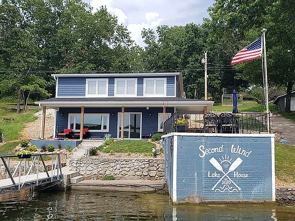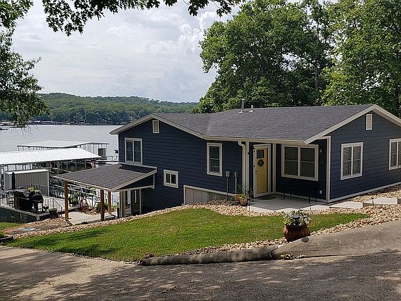Don't miss this furnished, move-in ready lake home with 100' of waterfront, at the 7.5 MM in North Buck Creek Cove (from Bagnell Dam). This home was completely rebuilt in 2023. Power and fiber (Co-Mo Connect) buried to house, all new electrical, plumbing, furnace, AC, water heater & softener system; new stainless GE appliances, and LG stacked washer/dryer. Luxury Vinyl Plank flooring throughout. High efficiency windows and exterior doors. Stove and dryer can be either electric or gas. Private well and septic. Large primary suite with walk-in closet and sitting area. Two bedrooms with oversized closets, one has 6'x6' cubby for office space or built-in bunks. Two full baths upstairs, one full bath down. Open and spacious lower level area has bright kitchen with island seating for 5, breakfast area, family room (wall mounted TV), 5' x 5' pantry, and full bath. The party deck on the boat house roof is steps away from the covered porch. All year-water under the 32' x 40', 2-well concrete deck, Rough Water Dock (new 2020). Swim deck has 4' built-in swim steps and WetSteps ladder, 8' retractable awning for additional shade. Boat slips are 10' x 22' and 10' x 28' with poly boat lifts. 6' x 12' dock shed with full roll-up door, outside tv, and refrigerator. Boat house has concrete patio roof and permitted lake-water pump. Off-street parking for 4-6 vehicles. 2-car garage and single stall under one roof (roof new 5/25) a few steps across the street (upper tier lot). Call or text 816-260-2589 to arrange a tour.
