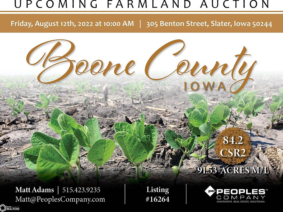 Boone County, Iowa Farmland Auction – Mark your calendar for Friday, August 12th! We are pleased to be representing the Estate of Vera F. Myers in the sale of 91.53 total acres m/l located in southeast Boone County between the towns of Madrid and Slater, Iowa. This farm, known as the "Hatgrove Farm" that dates back to the 19th Century, has been a long-time family heirloom of the Myers family. The farmland will be offered as a single tract via public auction. The auction will take place at 10:00 AM at the Slater Log Cabin in Nelson Park at 305 Benton Street in Slater, Iowa. Located in a strong farming community, this nearly 100% tillable farm includes 91.70 FSA cropland acres carrying a CSR2 soil rating of 84.2 with top-producing soils of Webster clay loam, Nicollet loam, and Clarion loam. Farmland acres are considered NHEL (Non-Highly Erodible Land) and do not include a conservation plan. Currently, there are 89.56 acres being farmed.