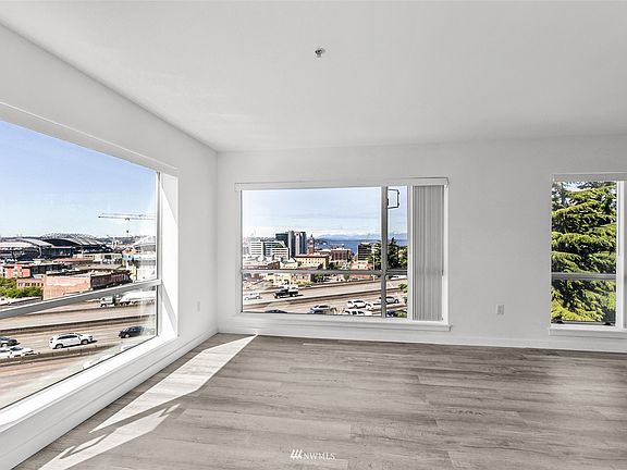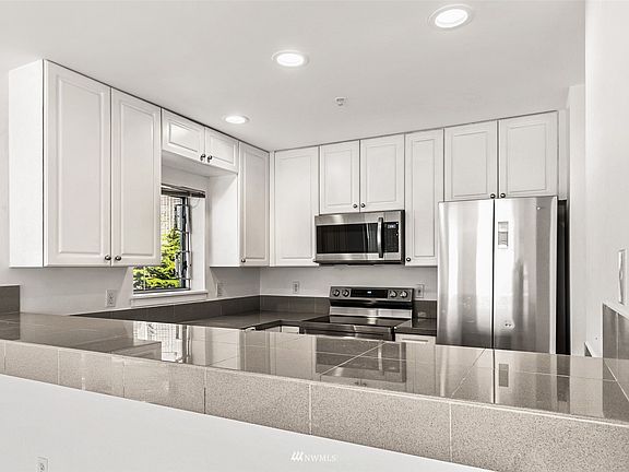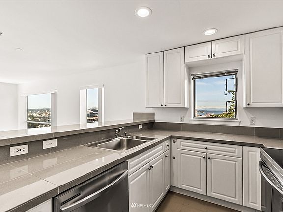 Sunny and bright coveted top floor corner unit boasting expansive windows & your very own private balcony perfect for relaxing & soaking up the spectacular sunset, city views & the Puget Sound! This unit features beautiful new vinyl plank flooring, new SS appliances including dishwasher, microwave, stove, refrigerator & freshly painted interior. Hot water heater replaced 1 year ago & in-unit W/D less than 3 years old. Gated building access, covered parking, private storage unit & built-in AC! Steps away from many restaurants, bakeries & coffee shops. Walk score 99/Transit Score 100. Pet friendly, no rental cap and no special assessments!