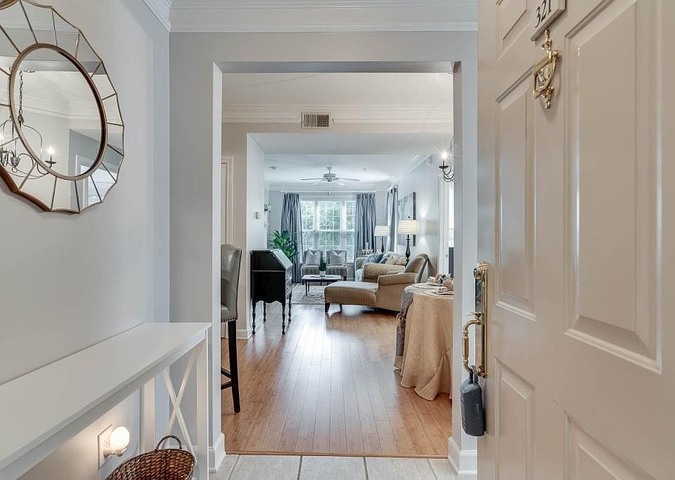 Rare opportunity to own a beautiful end unit in the sought after 300 Building at Ashford Condominiums! Enjoy the turnkey lifestyle with the perks of this beautiful second floor condo conveniently located near the stairs that leads you right to your assigned covered parking space #21. Also enjoy the easily accessible coded-entry elevator. As you step into the foyer of the condo it feels like a retreat with updated color palettes, bamboo flooring and a well-designed space. The cook's kitchen overlooks the dinette featuring a beautifully updated chandelier opening the space to the adjacent living room. The living room features a gas log fireplace that ideal for enjoying fall and winter months. Access the covered balcony from the living room the perfect space for a patio sofa and bistro table to enjoy a good book or glass of wine. The kitchen boasts plenty of cabinet storage, stainless steel appliances, a breakfast bar and a walk-in pantry. The condo features a split bedroom floor plan providing the comfort of privacy from both bedroom suites. The spacious owner suite features a large walk-in closet and spa style bath with a walk-in shower, separate soaking tub, and double vanity. The guest suite features a walk-in closet, oversized en-suite bath and lots of natural light from the bonus windows you gain as an end unit! Ideal location tucked away at the meeting of Ashford Dunwoody Road, Mt. Vernon Road and Chamblee Dunwoody Rd providing easy access to 400, I-285, Dunwoody Marta Station and all the restaurants and shopping Dunwoody has to offer. The gated community amenities include a resort style pool, fitness center, coded entry elevator and lush landscaping.