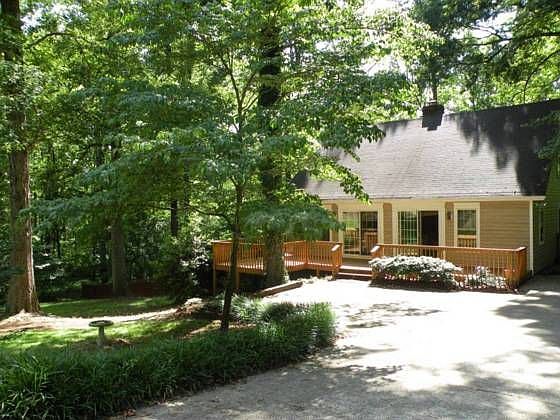 Beautiful 2.02 acre lot. Wooded w/ large shade trees. Creek on rear of lot. Master on main level. Large decked area. Fenced rear yard. Nice large out bldg. Great potential. Chalet style architecture. Hardwood, bruce flooring in most of home.