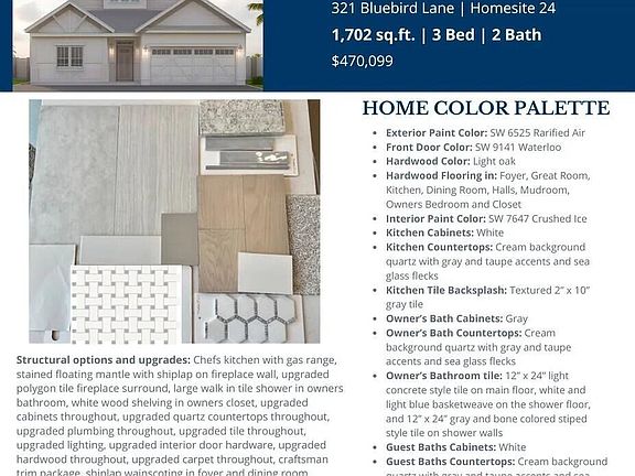 Songbird and The Kauai Cottage Home Plan are a winning combination! The wonderful Kauai is a 1702 sq. ft. plan with 3 bedrooms and 2 baths on one story. Structural options and upgrades include a Chefs kitchen with gas range, stained floating mantle with shiplap on fireplace wall, upgraded polygon tile fireplace surround, large walk in tile shower in owners bathroom, white wood shelving in owners closet, upgraded cabinets throughout, upgraded quartz countertops throughout, upgraded plumbing throughout, upgraded tile throughout, upgraded lighting, upgraded interior door hardware, upgraded hardwood throughout, upgraded carpet throughout, craftsman trim package, shiplap wainscoting in foyer and dining room