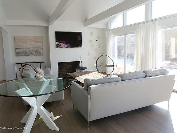 This open-concept living/dining area Ranch with vaulted ceilings was completely gutted and rebuilt with top-of-the line materials throughout in 2013. From the oversized two tier deck made of Ipe wood and replaced bulkhead and pilings that easily docks a 30 foot boat on the outside of the house, to the sleek kitchen with custom white high gloss lacquer cabinetry with caesarstone counters and wet bar cabinetry with ice maker and beverage wine cooler.The state of the art bathrooms have La Cava sinks and Dornbracht plumbing, Circa light sconces,custom cabinetry with glass and marble counters in glass tiled bathrooms. OFFERED PRICE INCLUDES LIFTING THE HOUSE to meet proposed FEMA + town requirements of AE-8 flood zone. High-end light fixtures and attached speakers included.A/C is 5ton system