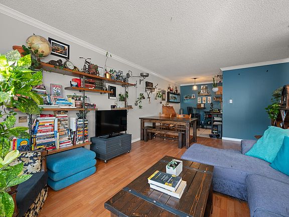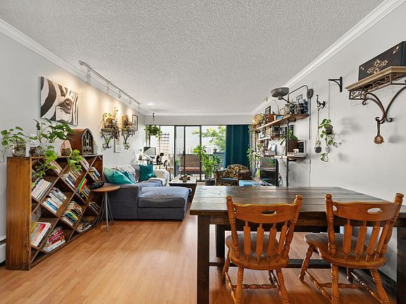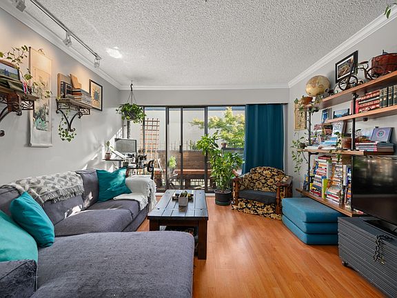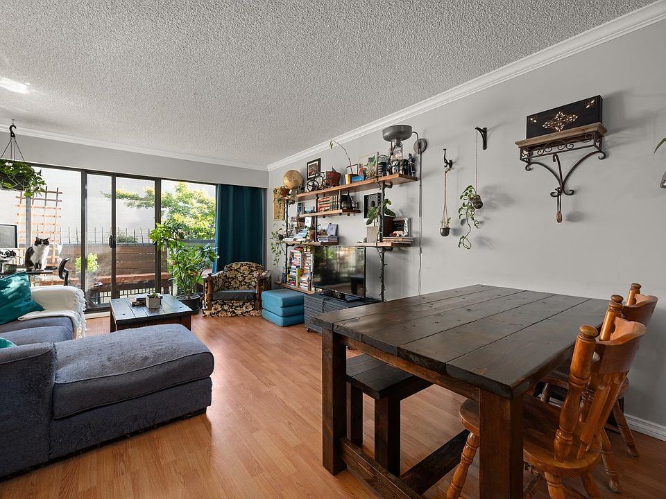 Step into this spacious top-floor suite in the heart of Mt. Pleasant, offering unmatched convenience & tranquility. The kitchen is a chef's delight, featuring a custom-built live edge breakfast bar, engineered granite countertops, & elegant crown molding, blending style and function. The expansive living and dining area comfortably accommodates a breakfast nook, six-seat table, sofa, & desk area, making it perfect for working from home. Venture outside to your private patio with charming peekaboo view, ideal for morning coffee & urban gardening enthusiasts. Many building updates.Enjoy proximity to Main St, Comm Dr, Skytrain, & bus routes. 1 parking & ample storage. This pet-friendly, community-oriented building is home to wonderful neighbours.