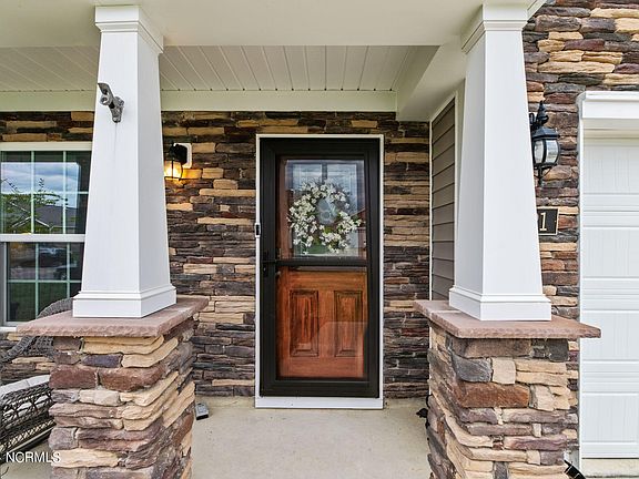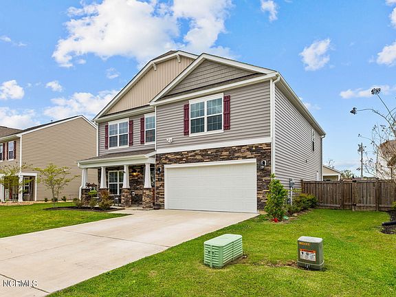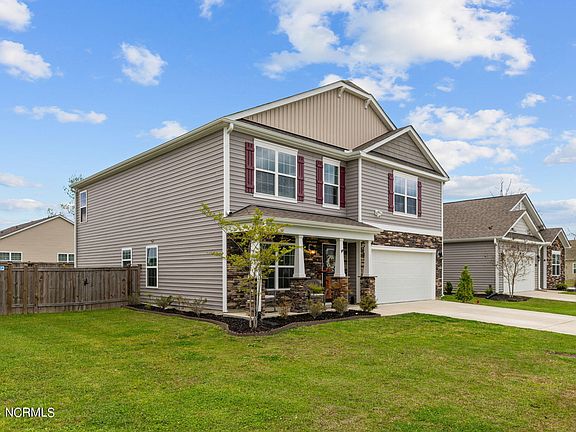 Welcome to 321 Ginger Drive, a stunning two-story home located in the heart of New Bern, NC. Built in 2020, this modern residence offers the perfect blend of comfort and sophistication, boasting 4 bedrooms and 2.5 bathrooms. Upon entering, you'll be greeted by a versatile space that can serve as either a home office or formal sitting area, providing the ideal setting for work or relaxation. To the right, you'll discover the elegant formal dining area, perfect for hosting gatherings and special occasions. The main living area is designed with an open concept layout, featuring a cozy corner fireplace that adds warmth and charm to the space. This seamlessly transitions into the expansive eat-in kitchen, complete with a breakfast bar featuring bar seating, an island with ample storage, stainless steel appliances, granite countertops adorned with a subway tile backsplash, and a generous corner walk-in pantry, catering to all your culinary needs. Convenience is key with a first-floor laundry room, making household chores a breeze. As you ascend the stairs, you'll find a loft area that provides additional living space and versatility. Retreat to the luxurious primary suite, boasting vaulted ceilings and an en suite bathroom complete with his and her sinks, a linen closet, a 5-foot wide shower with built-in shelving, and an expansive walk-in closet, offering a serene escape from the hustle and bustle of everyday life. Three additional bedrooms share a full-sized bathroom, providing ample space for family and guests. Step outside to your back patio and envision summer evenings spent relaxing and entertaining in the privacy of your own backyard. Conveniently located minutes from Historic Downtown New Bern and only a short drive to MCAS Cherry Point.