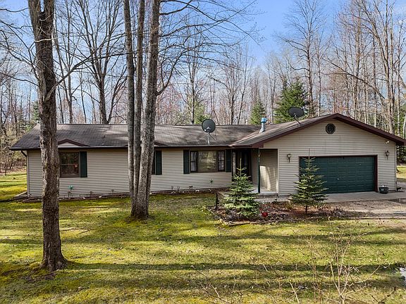 Imagine embracing a peaceful and tranquil lifestyle in your new home nestled on ten acres up north, with access to miles of scenic trails right at your doorstep. Picture yourself exploring the outdoors on your side-by-side, surrounded by nature's beauty. The home features an inviting open kitchen and dining area that looks out onto the serene back woods and gardens. This truly is a setting that's hard to come by. Master suite in the back has an updated beautiful bathroom w shower and tub and walk in closet. Cozy up by the fireplace in spacious living room with
