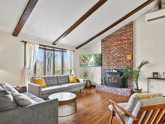 Spacious split-entry home offering comfort and flexibility! The open living room features a beamed, vaulted ceiling, hardwood floors, a pellet stove, and a bow window that brings in plenty of natural light. A formal dining area connects to a kitchen with generous cabinet and counter space—great for daily living or entertaining. Three comfortable bedrooms and a full bath complete the main level. The finished lower level offers great potential and adds extra living space with a large bonus room, full bath, laundry room, a versatile 4th bedroom or home office and tons of additional storage. Outside, enjoy a patio, storage shed, and ample off-street parking. Additional features include: *Hardwood floors through out most of the main level. *Mini-split system for cooling in Living Rm/Dining Rm. *Remodeled Bath with double vanity & custom tiled shower. *New vinyl plank flooring and fresh paint in lower level. *Perma-Lock aluminum roof (installed 2016, 45 year roof).