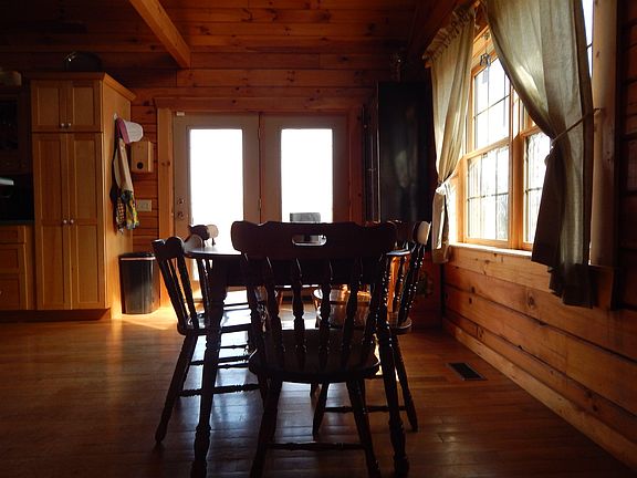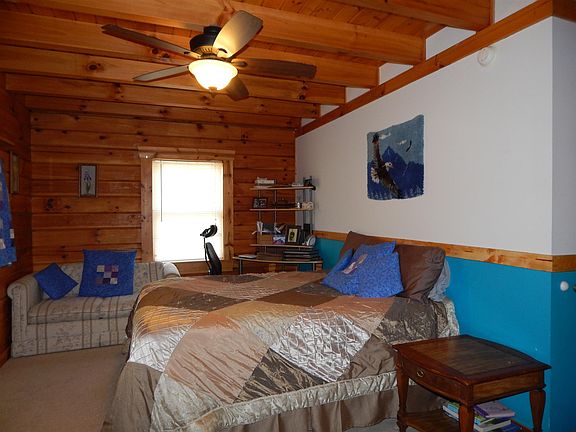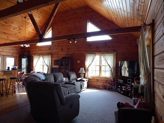 This log home is located on a quiet country lane minutes from town. The wrap-around deck and covered porch allow you to enjoy the peaceful surroundings. House features an open floor plan with exposed beams and an abundance of natural light. In addition to the great room space and fully equipped kitchen, there are 2 bedrooms, a full bath and laundry area on the main level. The loft encompasses the master suite with ample closet space and large bath. Full walkout basement is partially finished with a large family room, home office, bedroom and bath. Plenty of storage, utility room and workshop space complete the lower level. There is a detached garage and separate outbuilding with utilities currently used as a dog park with approximately 1/2 acre fenced with a total of 3.57 acres total.