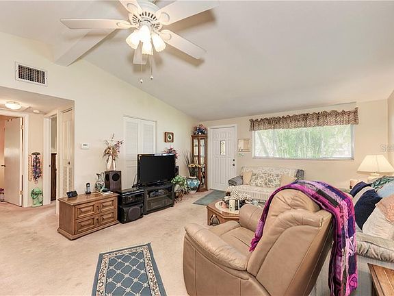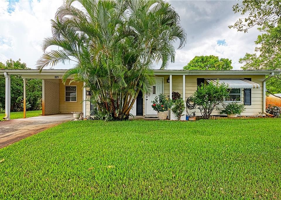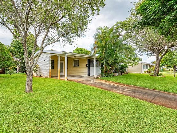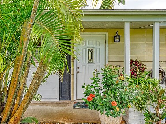 Cozy 2/3 bedroom home with 2 full baths, large Florida room & 22 x 12 covered porch area connecting 2 storage sheds! This home is nestled in a tropical plush green back yard filled with exotic plants & trees and Avocado, Mango, Papaya and more! Seller has a great passion for gardening and it shows! Watch the Blue Jays & Cardinals in the back yard! Very peaceful setting gazing through the 23 ft. Florida room with many light filtering windows watching nature in your own back yard! Home also has a inside laundry room! The layout is spacious with vaulted ceilings coming into the main living room. Those vaulted ceilings are carried through the Kitchen & bedrooms too! Many storage closets throughout! Bedroom 3 has its own entrance from the covered carport and also its own private bathroom & separate electric water heater. Perfect for a family member needing their own space. The guest bath has a tub/shower combination with heat lamp feature. Cozy eat-in kitchen has a updated stainless faucet, plant shelving and a pass through breakfast bar to the Florida room. Home also features awning & hurricane coverings for the home. You will be amazed at the space in this wonderfully maintained home. Pride in ownership truly evident! Call today!